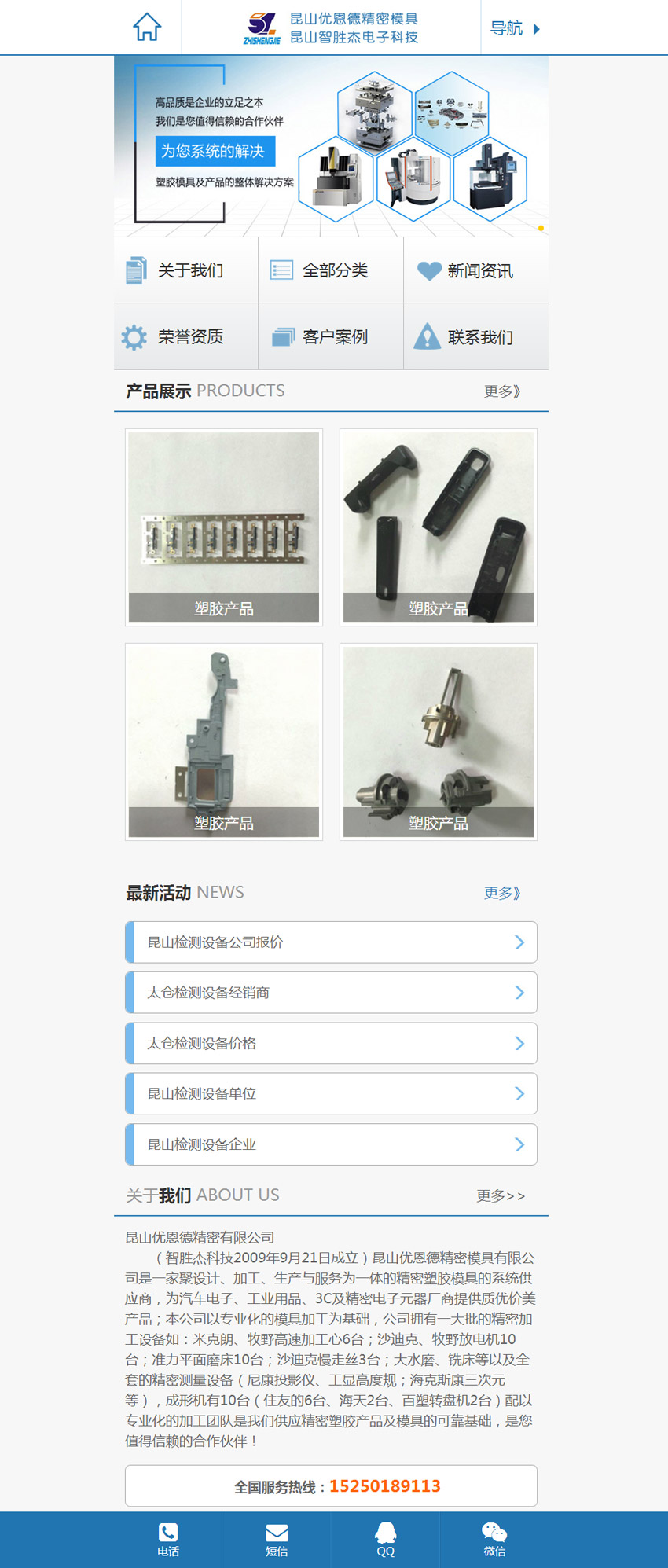 昆山優恩德精密模具有限公司是一家聚設計、加工、生產與服務為一體的精密塑膠模具的系統供應商,為汽車電子、工業用品、3C及精密電子元器廠商提供質優價美產品;本公司以專業化的模具加工為基礎,公司擁有一大批的精密加工設備如:米克朗、牧野高速加工心6臺;沙迪克、牧野放電機10臺;準力平面磨床10臺;沙迪克慢走絲3臺;大水磨、銑床等以及全套的精密測量設備(尼康投影儀、工顯高度規;海克斯康三次元等),成形機有10臺(住友的6臺、海天2臺、百塑轉盤機2臺)配以專業化的加工團隊是我們供應精密塑膠產品及模具的可靠基礎,是您值得信賴的合作伙伴!